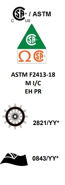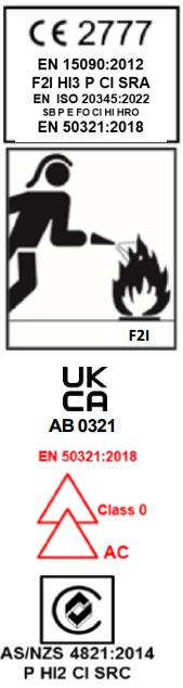 European Standard CE and UKCA Approved – EN 15090: 2012 (F2 HI3 P CI SRA) EN ISO 20345: 2022 (SB P E FO CI HI HRO) EN 50321-1:2018 Class 0 (for installation with nominal voltage up to 1000V A.C and 1500V D.C.) Australian New Zealand Standard Approved – AS/NZS 4821: 2014 (P HI2 CI SRC) F2I = Type 2 footwear for firefighters suitable for fire rescue, fire suppression, property conservation & etc. with electrical insulating SB = Standard Basic Protection as per EN ISO 20345 HI3 = Heat Insulation Level 3 (under EN 15090:2012) HI2 = Heat Insulation Level 2 (under AS/ NZS 4821:2014) CI = Cold Insulation SRA = Slip Resistance on ceramic tile with Sodium Lauryl Sulphate SRC = SRA + Slip Resistance on steel surface with glycerin FO = Fuel Oil Resistant Outsole E = Heel Energy Absorption P = Nail Penetration Resistance HRO = Resistance to hot contact CSA Z195-14 / ASTM F2413-18 Grade 1 Toe protection Compression resistance, 11kN Nail penetration resistance 18 kV Electric Shock Resistance (ESR) protection Council Directive 2014/90/EU On Marine Equipment (MED) Complies Module B & D requirements *YY = year marking is affixed on the boot Merchant Shipping (Marine Equipment) Regulation 2016 Complies Module B & D requirements *YY = year marking is affixed on the boot